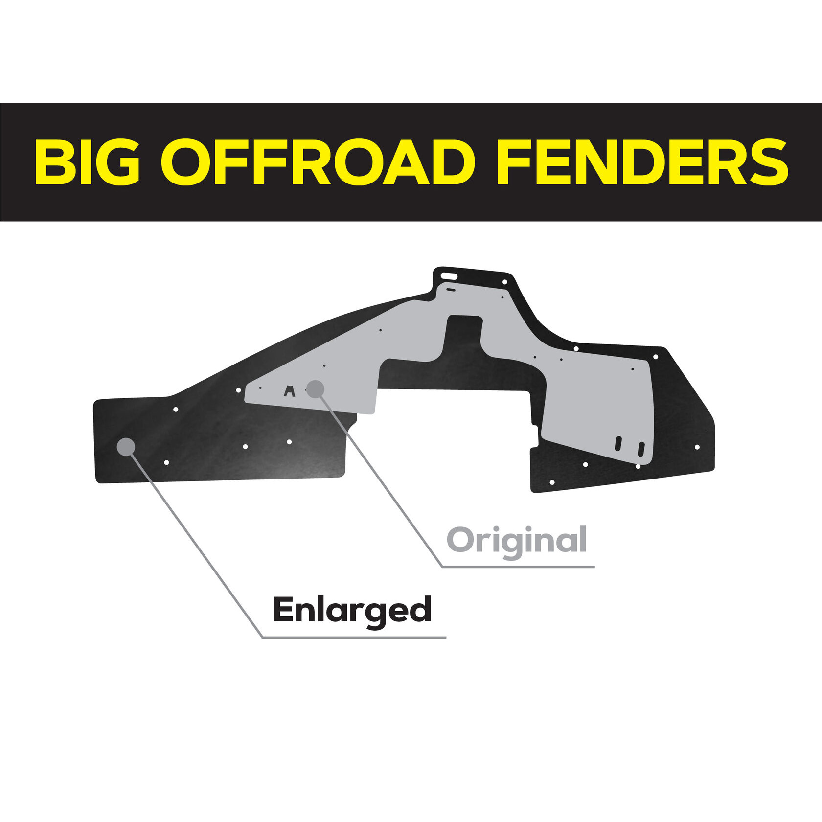 Повний комплект посиленого брудозахисту моторного відсіку для встановлення на передню вісь автомобіля. Площа посиленого брудозахисту значно більша за штатний, що дозволяє йому ефективно захищати не тільки моторний відсік, але й важливе електрообладнання, таке як генератор і стартер. Цей посилений брудозахист розроблений спеціально для експлуатації як у міських умовах, так і на найскладніших позашляхових трасах