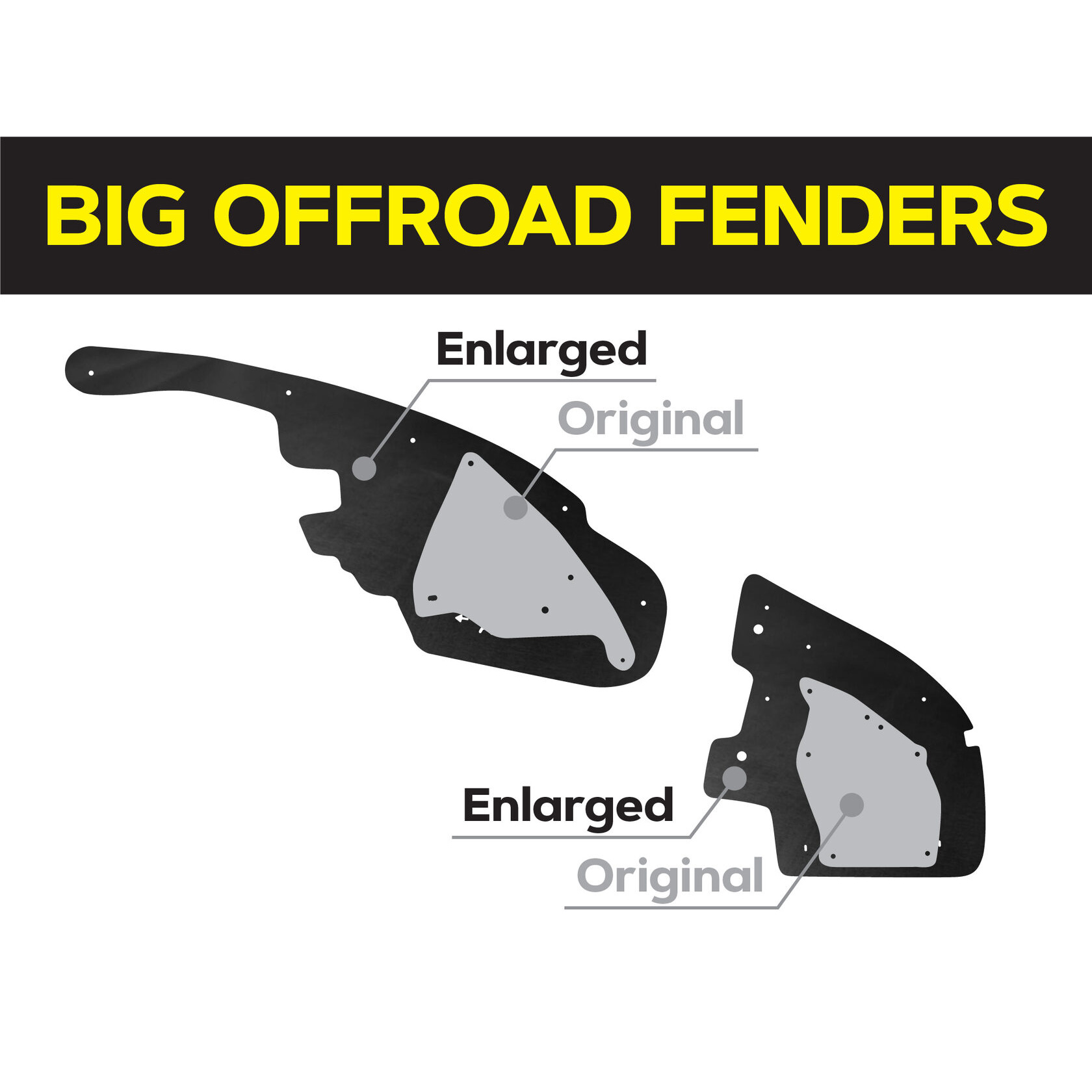 Повний комплект посиленого брудозахисту моторного відсіку для встановлення на передню вісь автомобіля. Площа посиленого брудозахисту значно більша за штатний, що дозволяє йому ефективно захищати не тільки моторний відсік, але й важливе електрообладнання, таке як генератор і стартер. Цей посилений брудозахист розроблений спеціально для експлуатації як у міських умовах, так і на найскладніших позашляхових трасах.