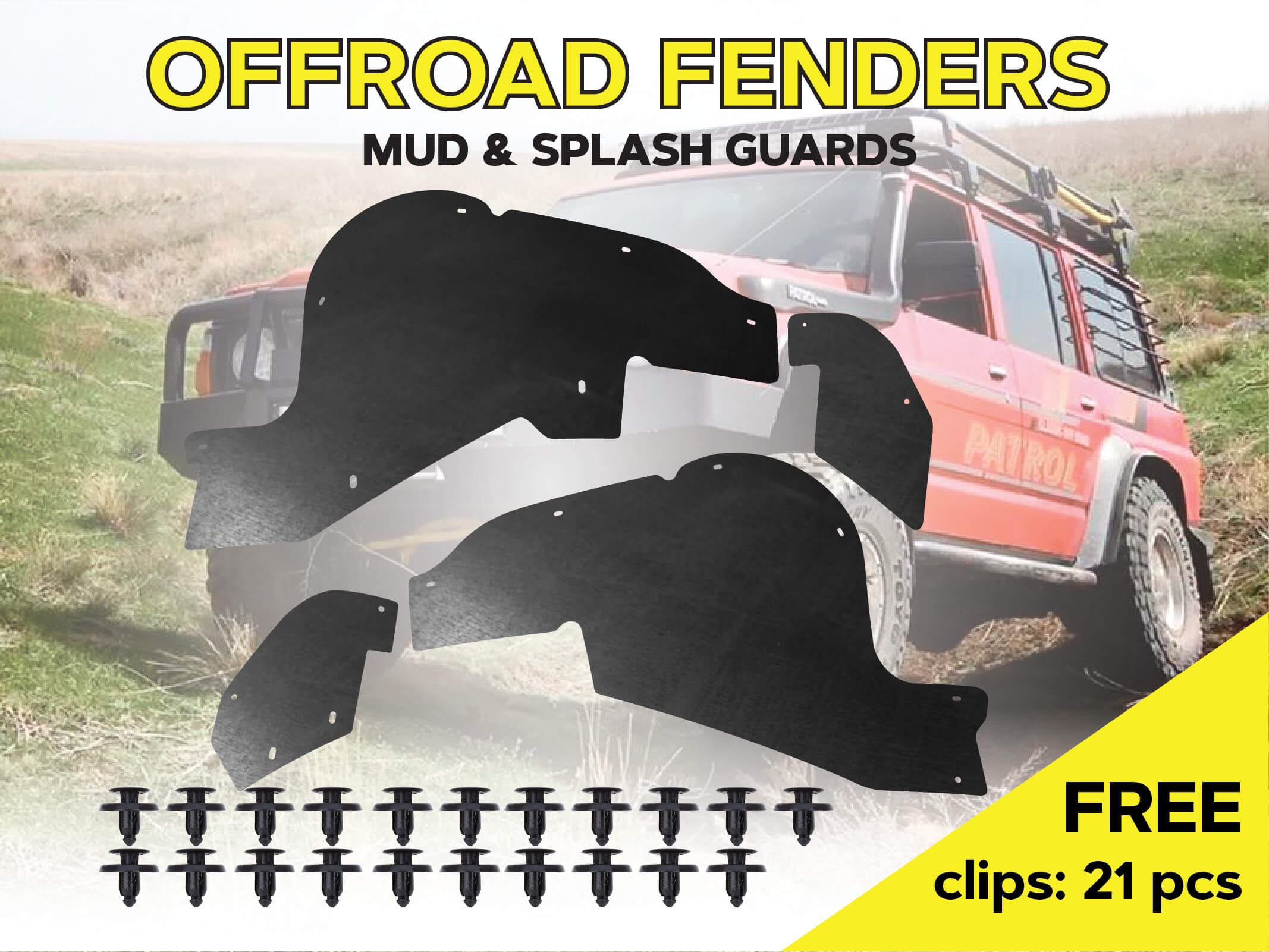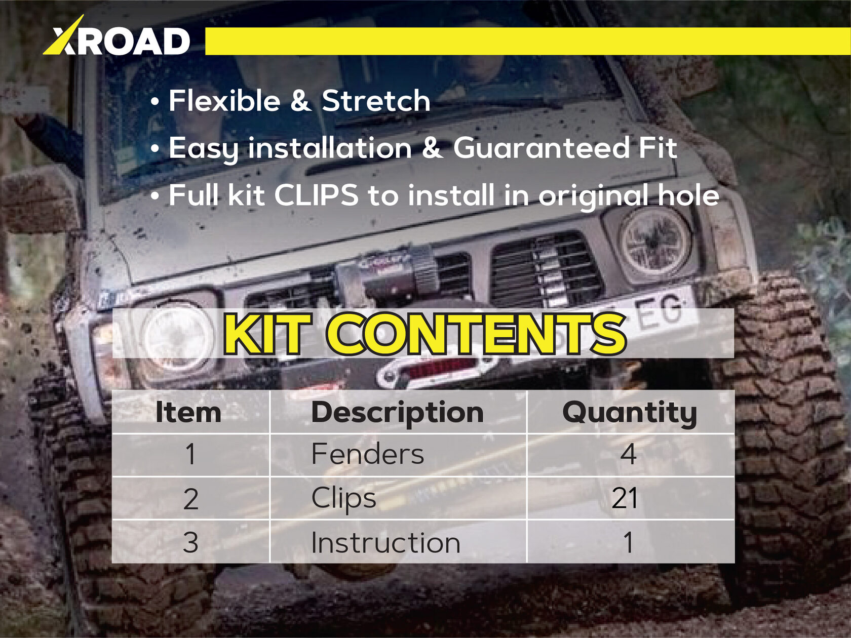 Склад комплекту: 4 посилених пильники для передніх колісних арок, монтажний набір кліпс, інструкція.