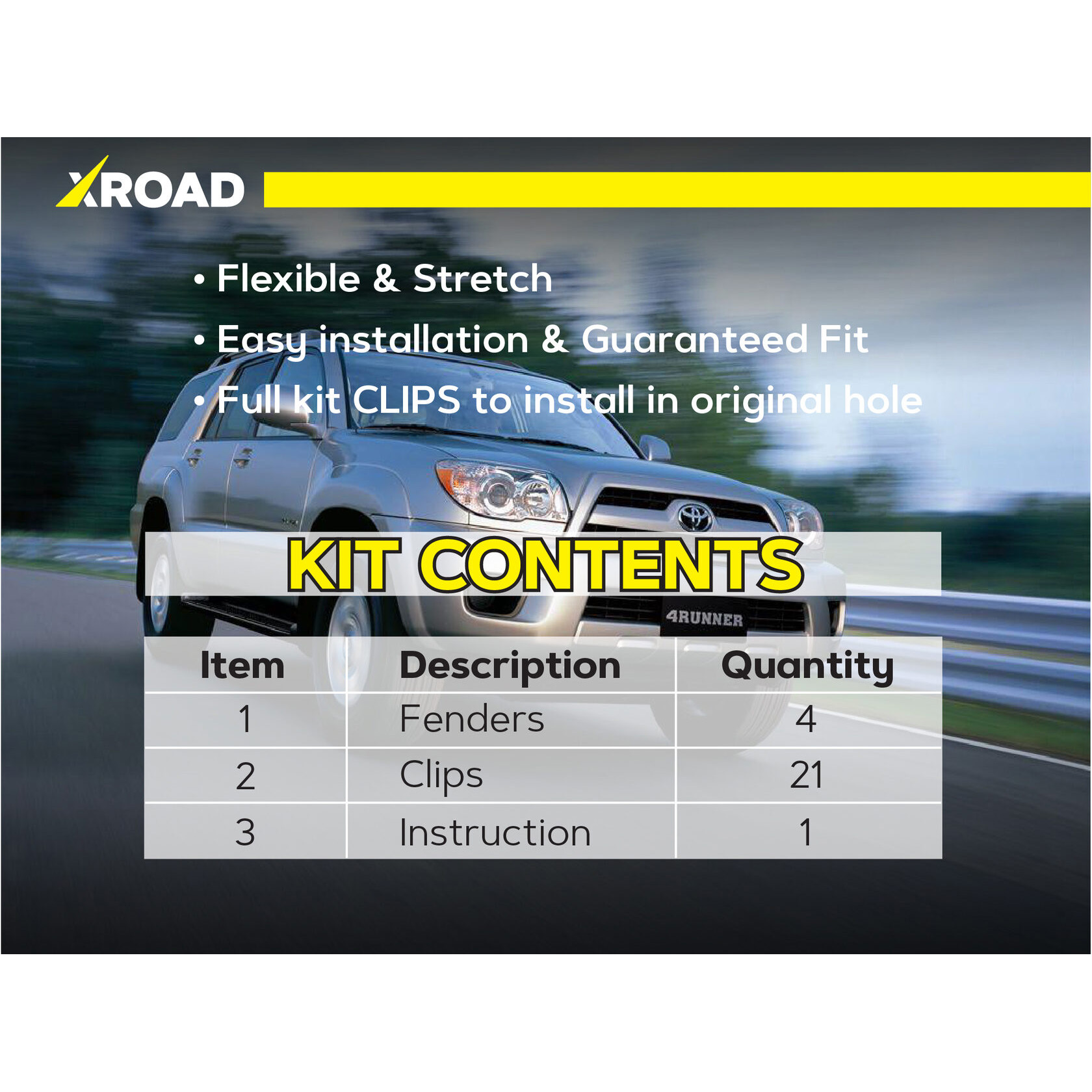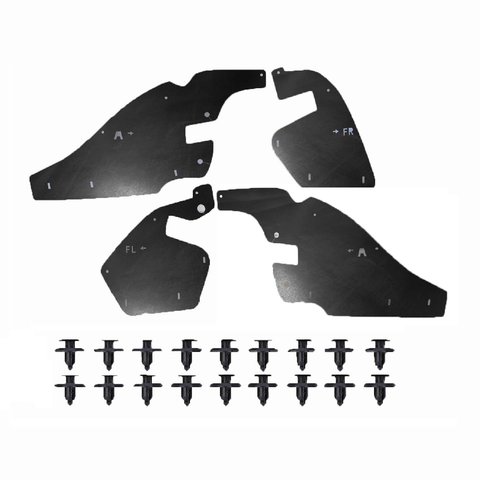 Склад комплекту: 4 посилених пильники для передніх колісних арок, монтажний набір кліпс, інструкція.