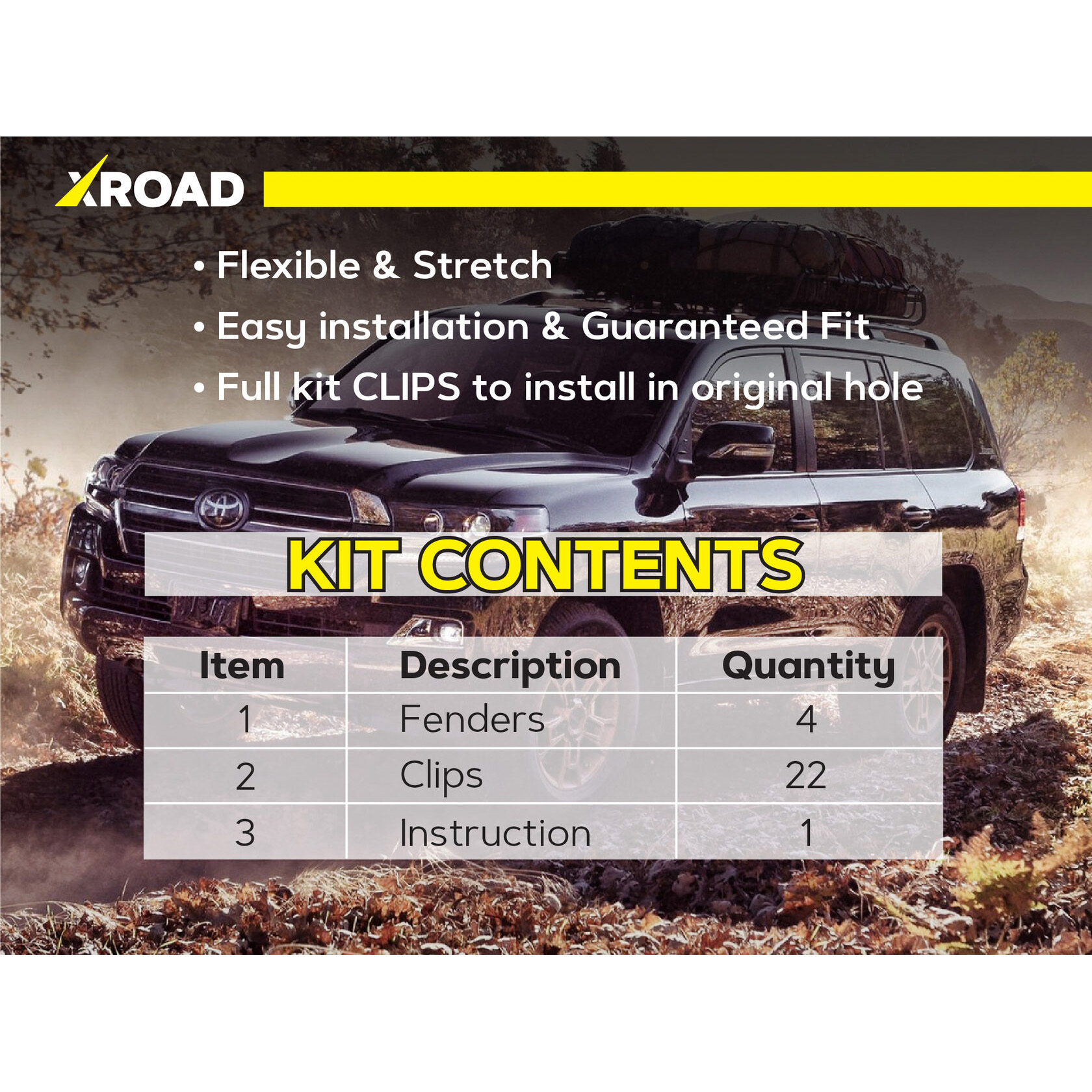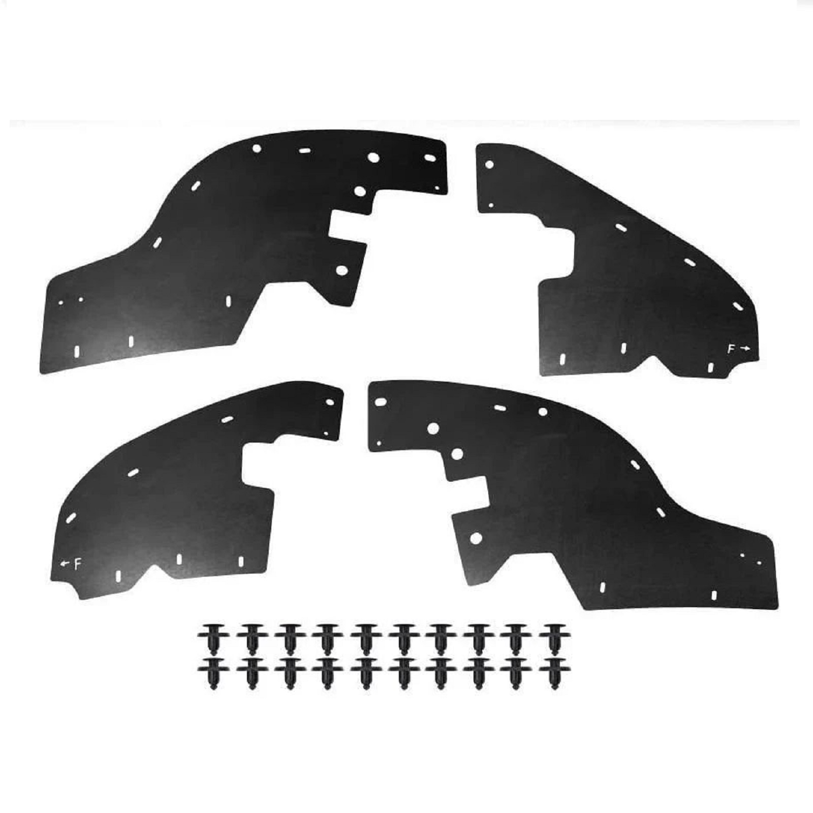 Склад комплекту: 4 посилених пильники для передніх колісних арок, монтажний набір кліпс, інструкція.