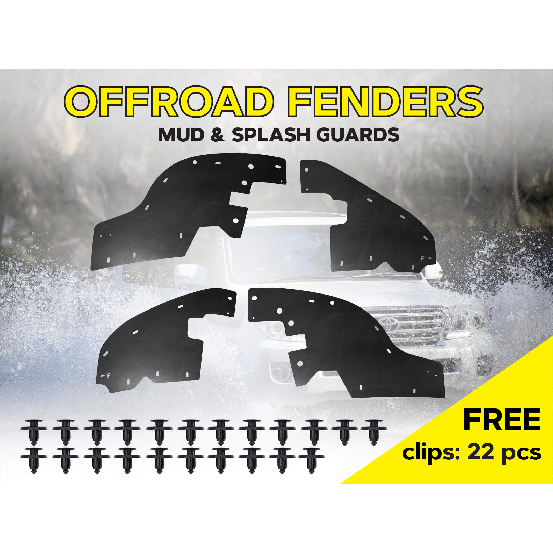 Повний комплект посиленого брудозахисту для встановлення на передню вісь автомобіля. Ефективно захищаэ не тільки моторний відсік, але й важливе електрообладнання від пилу, бруду, води, гілок, дрібних каменів та інших сторонніх елементів.