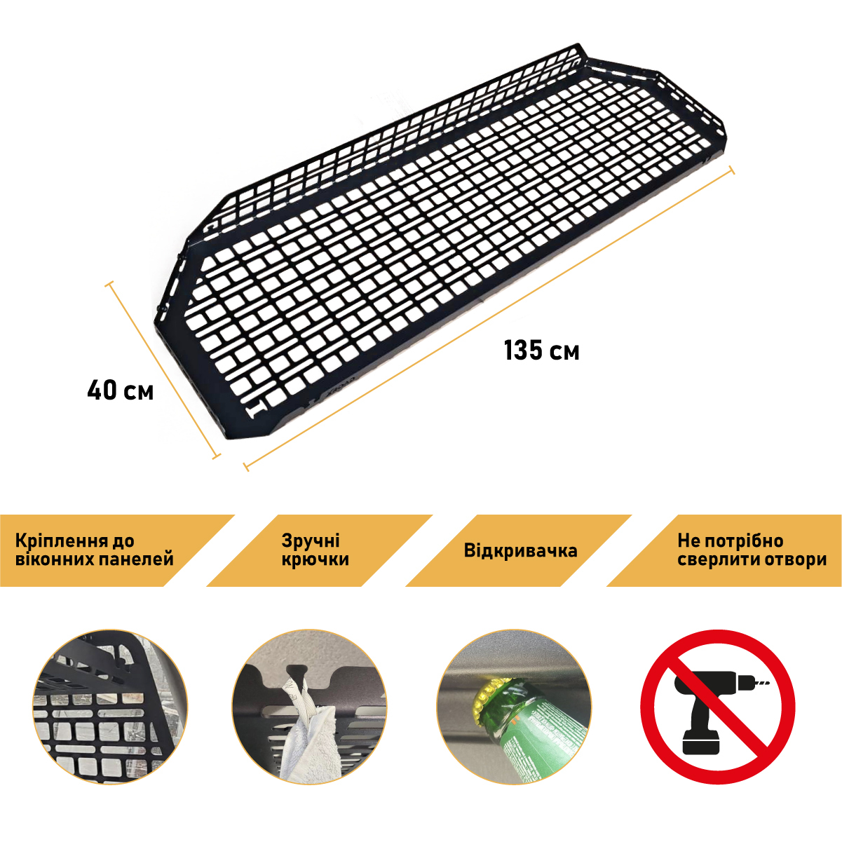 Полиця кріпиться до Молле-панелі на вікна (панелі на вікна в комплект не входять, їх можна купити окремо). Для монтажу полиці не потрібно свердління деталей автомобіля, що забезпечує швидке та просте встановлення. Ви зможете встановити полицю самостійно без допомоги спеціалістів.