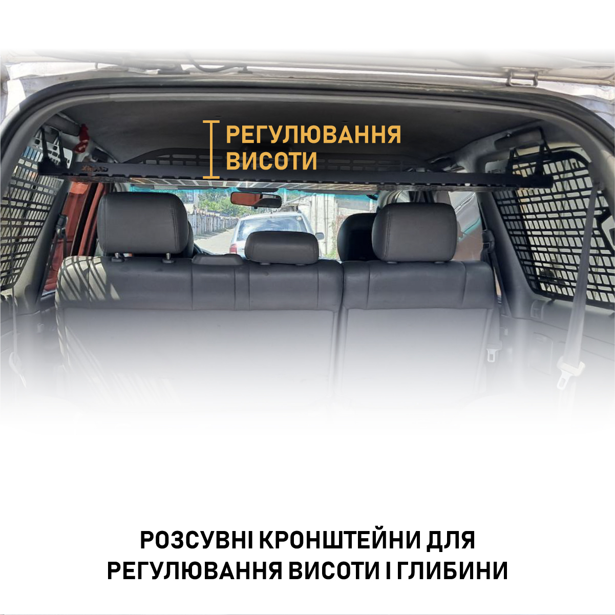 Полиця встановлюється під ручки третього ряду сидінь (якщо ручок немає, то закладні гайки для кріплення все одно присутні у кузові) і не вимагає свердління деталей автомобіля, що забезпечує швидке та просте встановлення. Ви зможете встановити полицю самостійно без допомоги спеціалістів. Встановлення передбачає можливість регулювання полиці не тільки за висотою, а й по поздовжньому положенню – її можна змістити ближче до передньої або задньої частини автомобіля