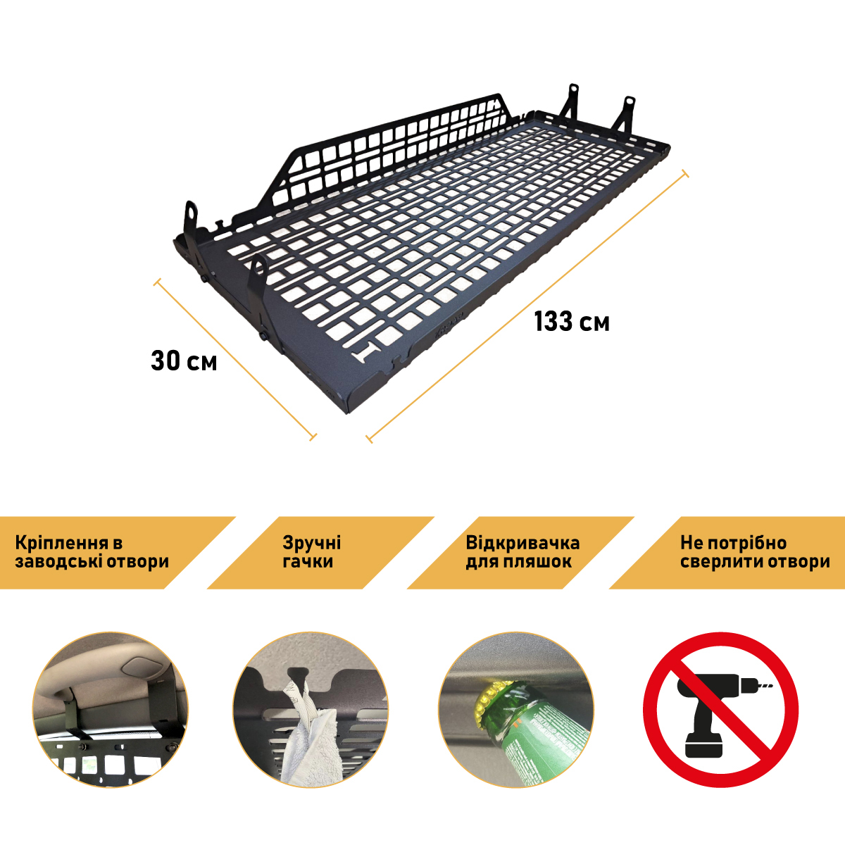 Полиця кріпиться до Молле-панелі на вікна (панелі на вікна в комплект не входять, їх можна купити окремо). Для монтажу полиці не потрібно свердління деталей автомобіля, що забезпечує швидке та просте встановлення. Ви зможете встановити полицю самостійно без допомоги спеціалістів.