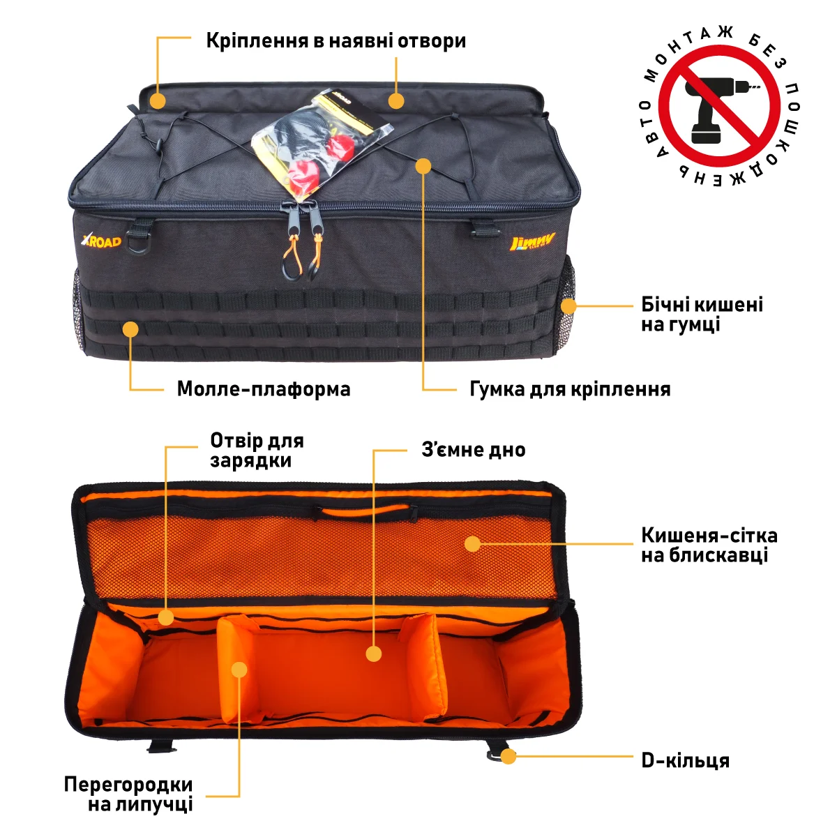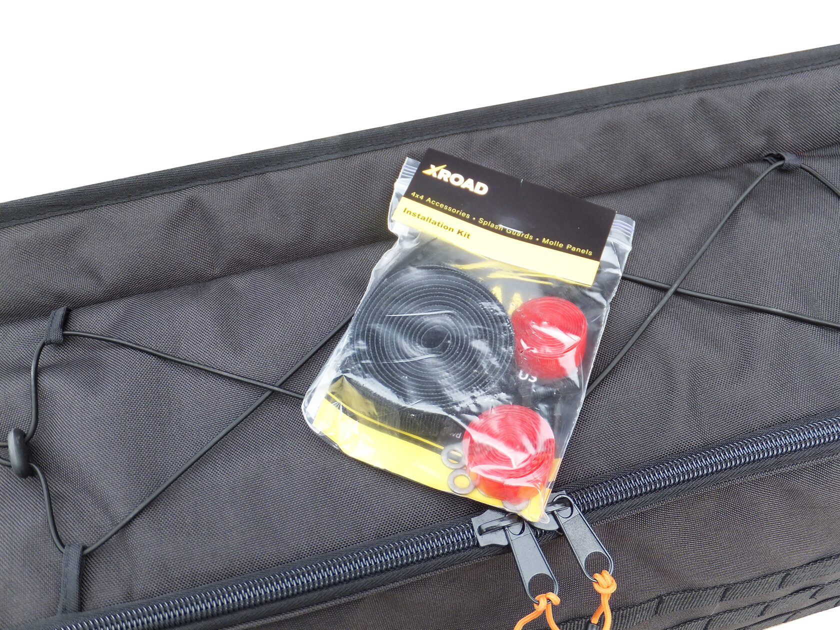 Комплектація: одна сумка, набір болтів та шайб для основної установки, велкро (липучка) та двосторонній скотч для додаткового кріплення до пластику.
