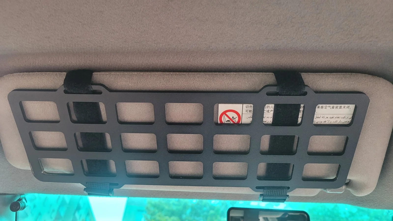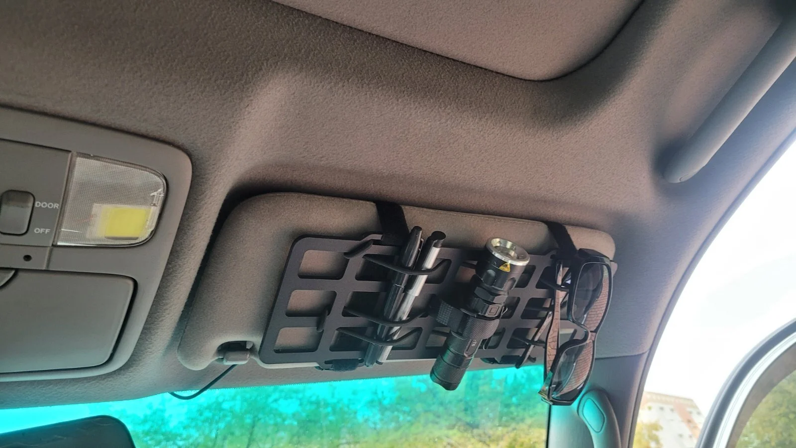 Молле платформа органайзер на сонцезахисний піддашок автомобіля для зручного розміщення EDC. Кріпиться швидкознімними велкро-хомутами, не вимагає свердління. Панель жорстка і, на відміну від тканинних аналогів, не провисає під вагою спорядження. При необхідності органайзер за секунди відстібається разом із спорядженням.