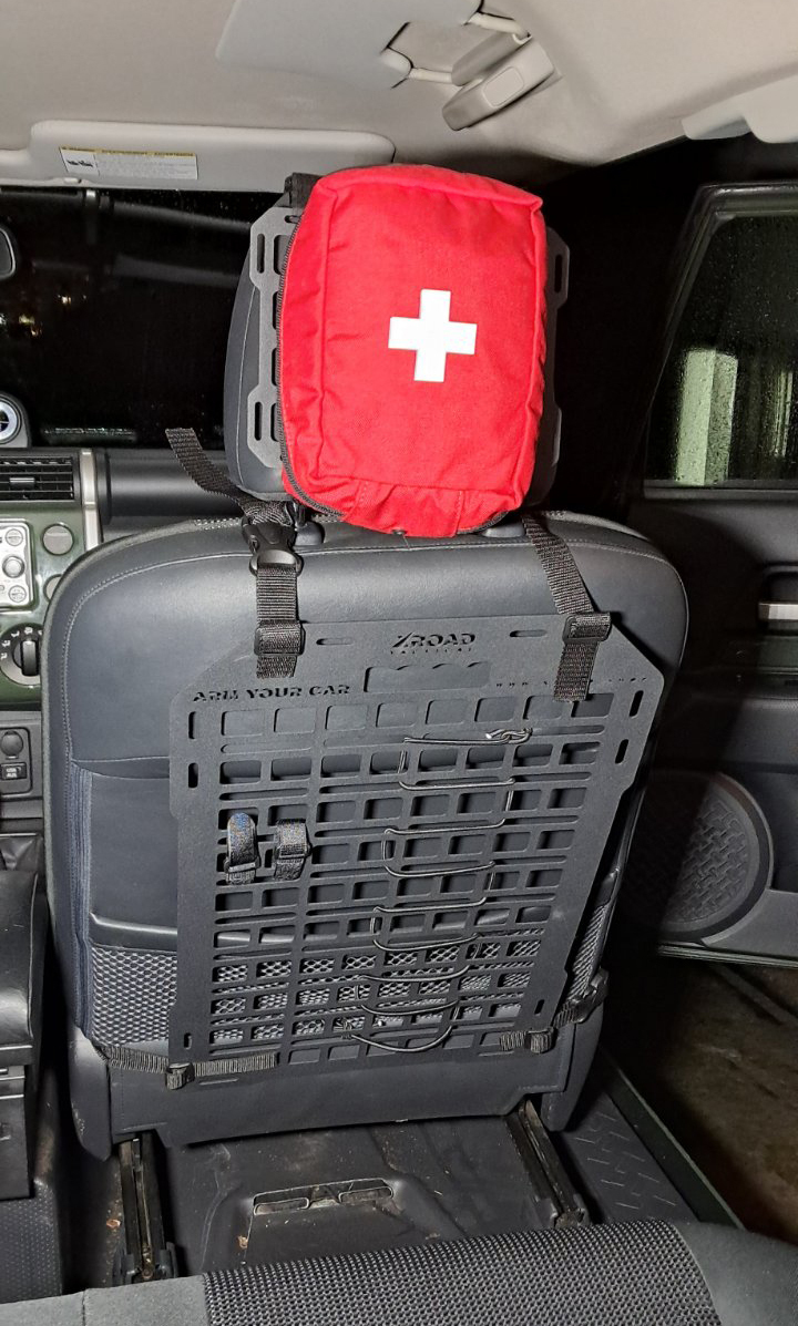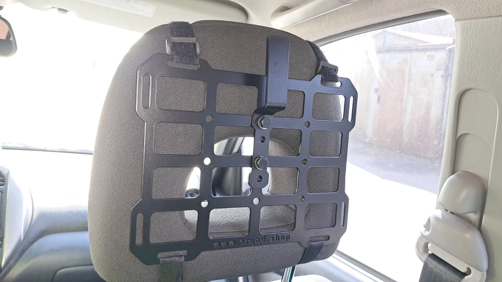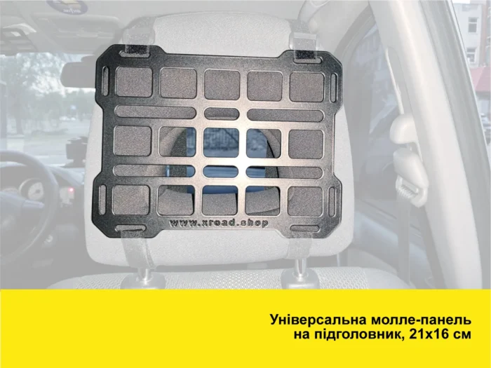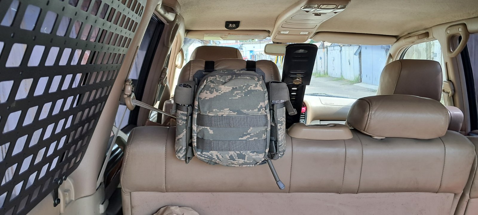 Молле платформа органайзер на підголівник автомобіля для швидкого доступу до аптечки, інструментів, зброї. Кріпиться швидкознімними велкро-хомутами. Панель жорстка, і на відміну від тканинних аналогів, не провисає під вагою спорядження. При необхідності панель за секунди відстібається разом із спорядженням.